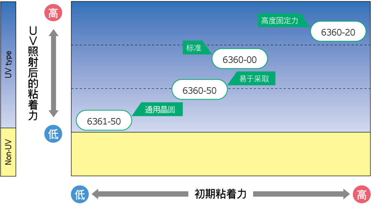粘著力:(2.6N/10mm, UV硬化后0.10 N/10mm)※在90°剝離條件下進(jìn)行測(cè)量