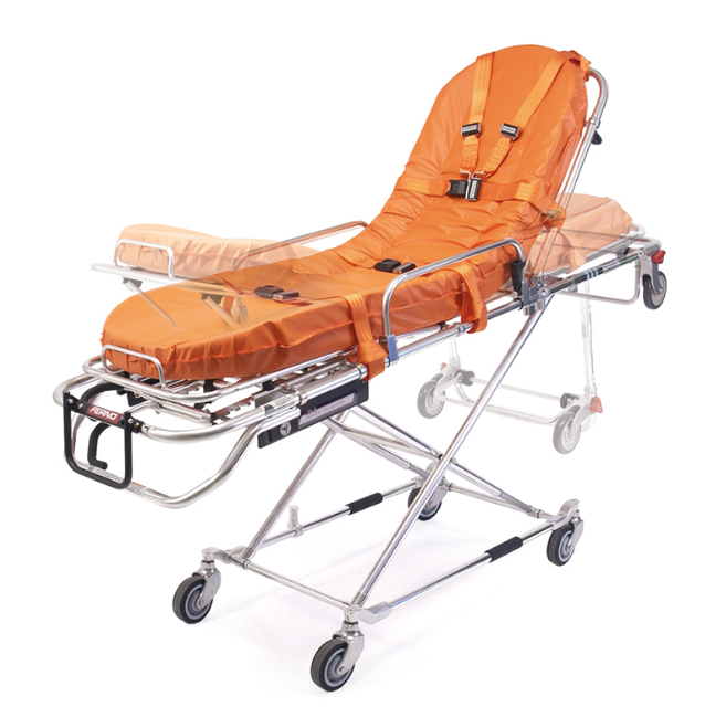救護車中使用的急救擔架帶有輪子,可以更輕松地在人行道上運輸,并且在救護車內(nèi)設(shè)有鎖,在運輸過程中用帶子固定病人。擔架上的一個整體凸耳鎖定在救護車內(nèi)的彈性閂鎖中,以防止在運輸過程中移動。現(xiàn)代擔架也可能有電池供電的液壓系統(tǒng)來自動抬高和折疊腿,這減輕了急救人員的工作量,據(jù)統(tǒng)計,他們由于重復(fù)抬放病人而有很高的背部損傷風(fēng)險。還有為肥胖患者提供的擔架,其具有更寬的框架和更高的承重能力,適合較重的患者。擔架通常用一次性床單或包裹物覆蓋,并在每次使用后清潔以防止感染傳播。醫(yī)療設(shè)備和靜脈注射藥物的架子、掛鉤和桿也經(jīng)常包括在內(nèi)。